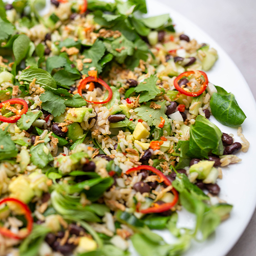 - Remove the seeds from the chilli, finely dice and add to the bowl along with the brown rice and black beans.