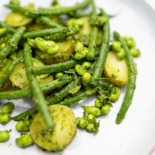 - Let the potatoes cool slightly, then slice and place in a bowl and spoon over the salsa verde and mix well. Add the Green Beans and Edamame, mix again and serve.