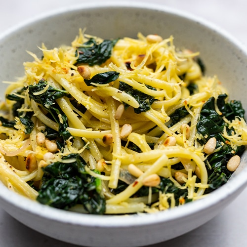 A really tasty and easy to make, midweek recipe. This dish is made with our organic pasta, nutrient dense cavolo nero and organic pine nuts.